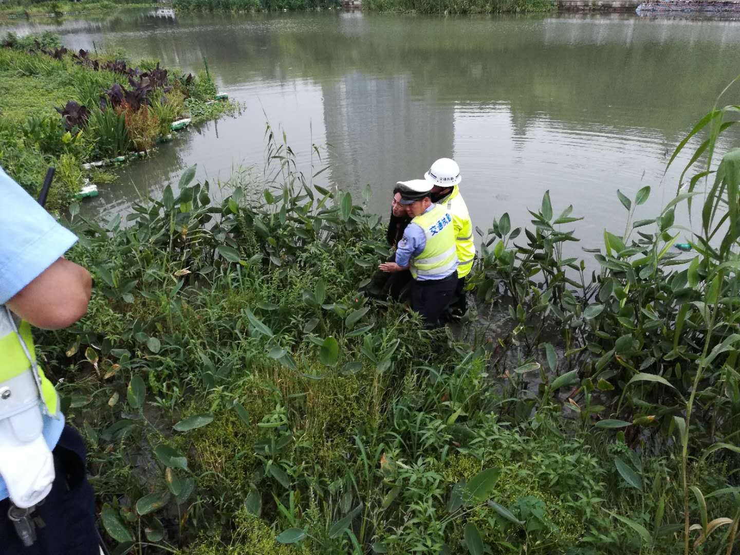 5月25日下午4點(diǎn)15分左右,保安公司道路交通指揮人員在執(zhí)勤過程中,接到指揮對(duì)講機(jī)通知,在同豐橋北側(cè)有一女子欲跳河輕生。當(dāng)班隊(duì)長立即帶領(lǐng)三名水性較好隊(duì)員前往現(xiàn)場(chǎng)救援。抵達(dá)現(xiàn)場(chǎng)后,該女子已經(jīng)跳入水中,情況十分緊急,隊(duì)員葉子濤、周長豐在隊(duì)長的指揮下,立即下水開展救援行動(dòng),經(jīng)過不懈努力,成功將輕生女子拉至岸邊。隊(duì)長鄭春明為防止此女子再度跳河,耐心的對(duì)她做思想工作,直至交警趕到現(xiàn)場(chǎng)將她帶走才離開。